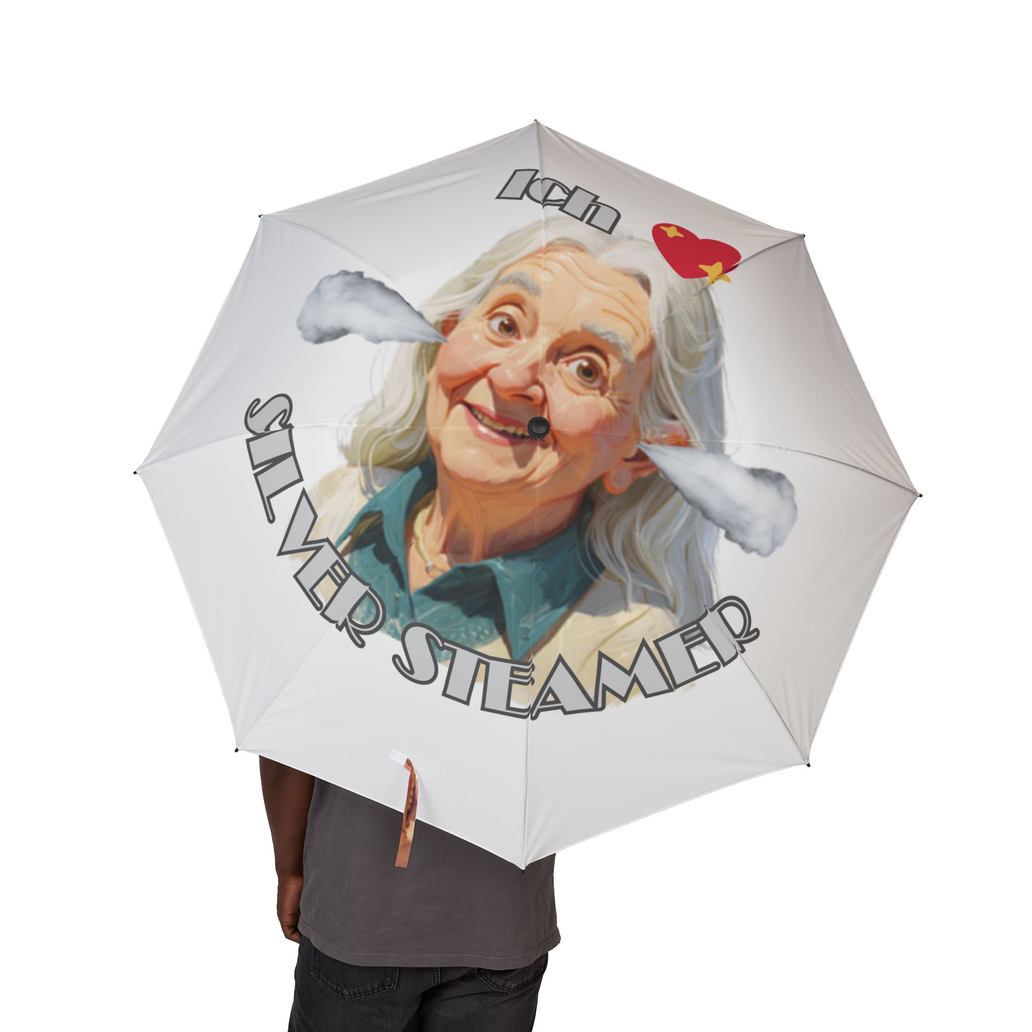 Ein echter Silver Steamer lässt sich von Wind und Wetter nicht aufhalten. Mit unserem robusten Regenschirm trotzen Sie jedem Sturm, während Sie stilvoll und trocken bleiben. Das widerstandsfähige Material und die stabile Konstruktion sorgen dafür, dass Sie bei jedem Abenteuer bestens geschützt sind. Das einzigartige Design erinnert Sie daran, dass Sie auch bei Regen und Graupel immer unter ‘Dampf’ stehen. Es ist nicht nur ein Regenschirm, sondern ein Symbol für Abenteuerlust und Widerstandsfähigkeit.